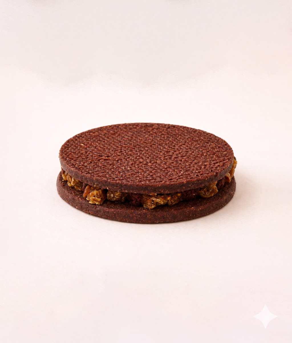 진한 초코 맛 크림 사이에 들어간 건조 무화과를 느낄 수 있는 샌드쿠키