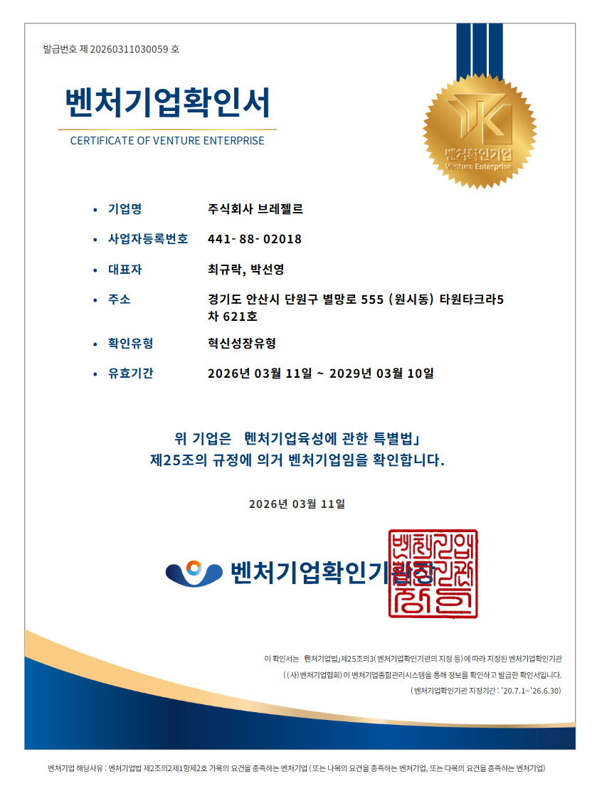 2021.06 주식회사브레젤르 법인 설립 / 공장 설립 (안산시 원시역)